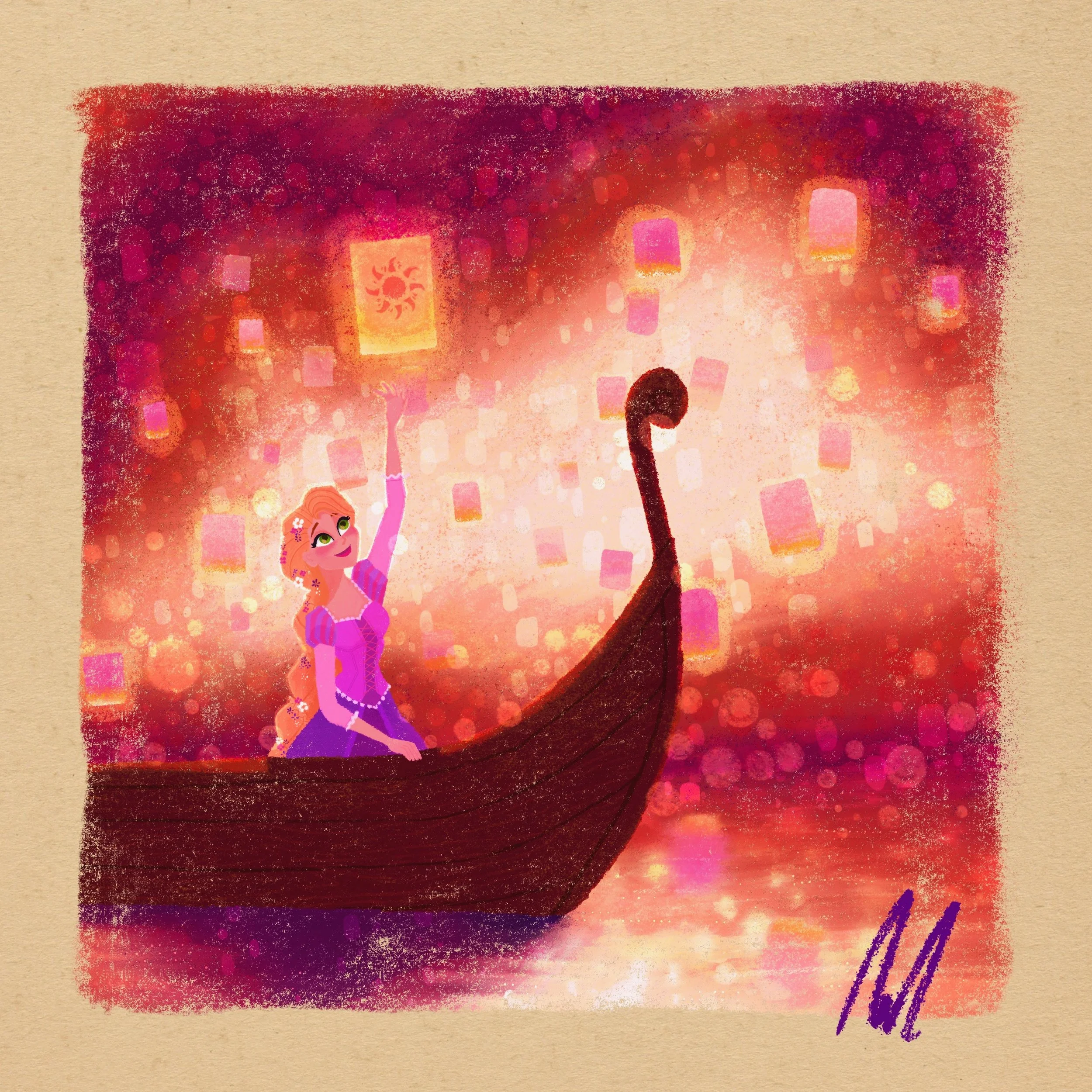 For this piece I knew I had to capture the warm glow of the thousands of lanterns from that sequence, and the beautiful cascade of colors on the water. I was really inspired by the 2017 animated television show in terms of translating Rapunzel to 2d, and you can see that design influence in the way I drew her face and the shape of her hair.